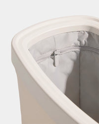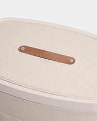 - Features a neutral, cream canvas exterior with a slim profile lid